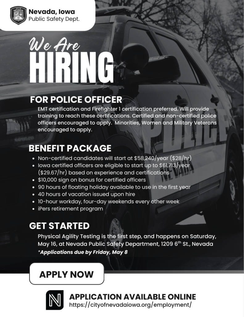 Learn more and apply: https://cityofnevadaiowa.org/employment/